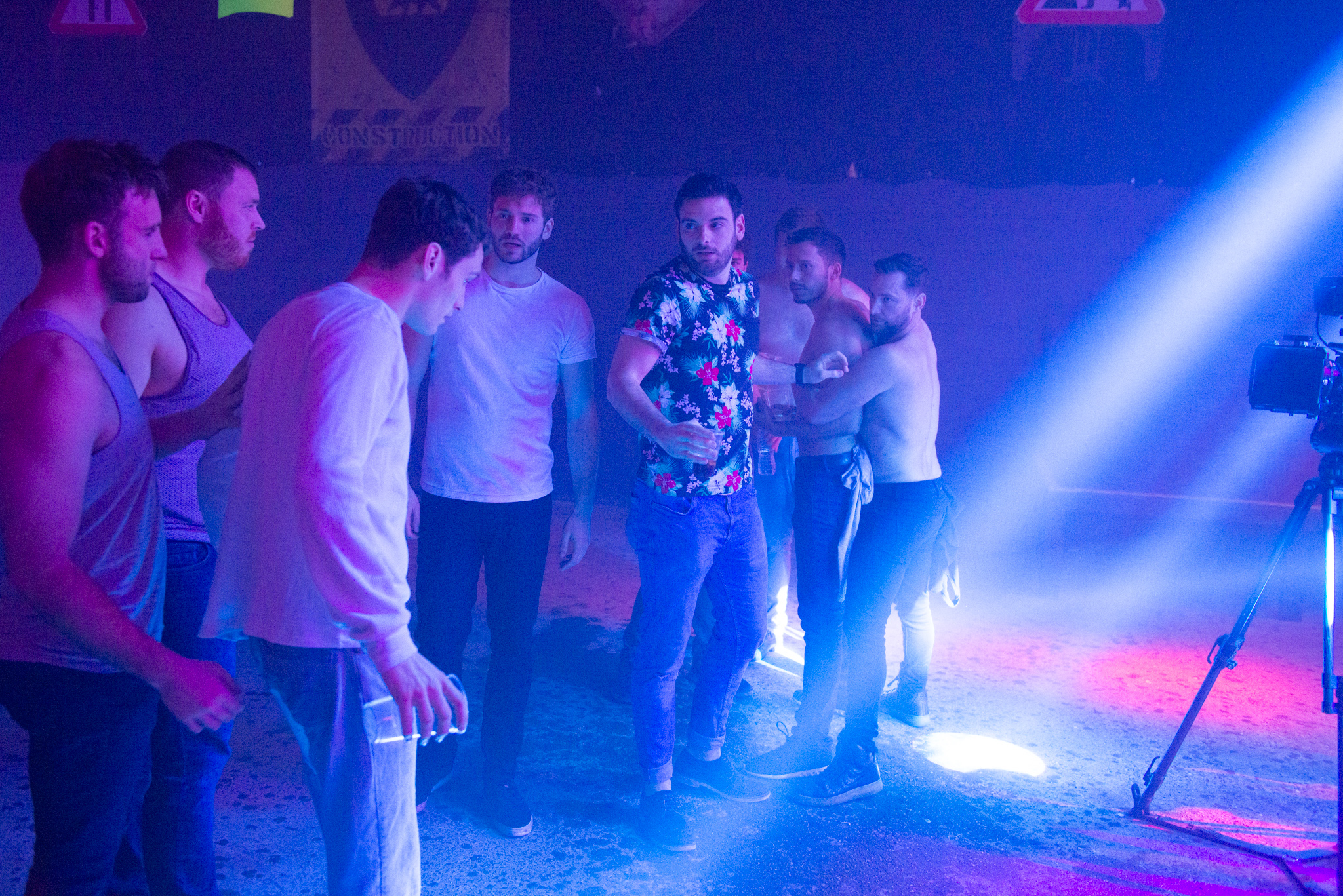 “In this scene we were filming in XXL during the day before the club opened. We had the lighting engineer re-create the same lighting setup he would later use when the club would be opened and we ‘faked’ the room being full with extras, all dancing in silence. This allowed us to record clean dialogue from the actors without background noise or music. We then came back in the evening when the club was open and full to shoot the wider shots. Everything cut together seamlessly.”