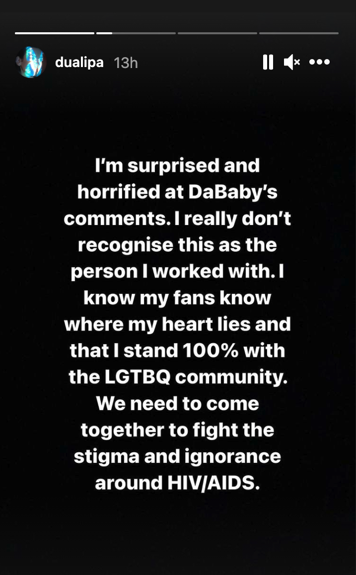 “I’m surprised and horrified at DaBaby’s comments,” Dua wrote on her Instagram story. “I really don’t recognize this as the person I worked with.