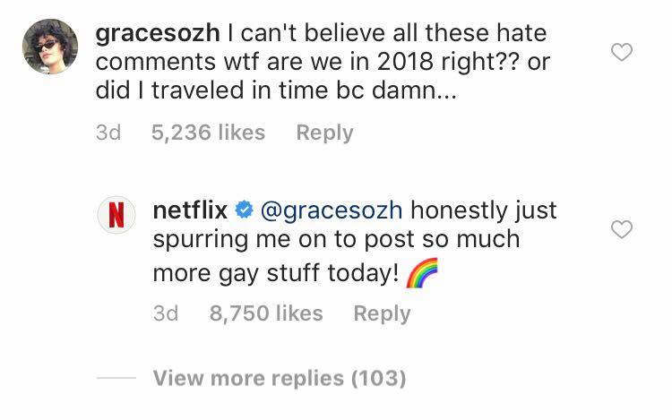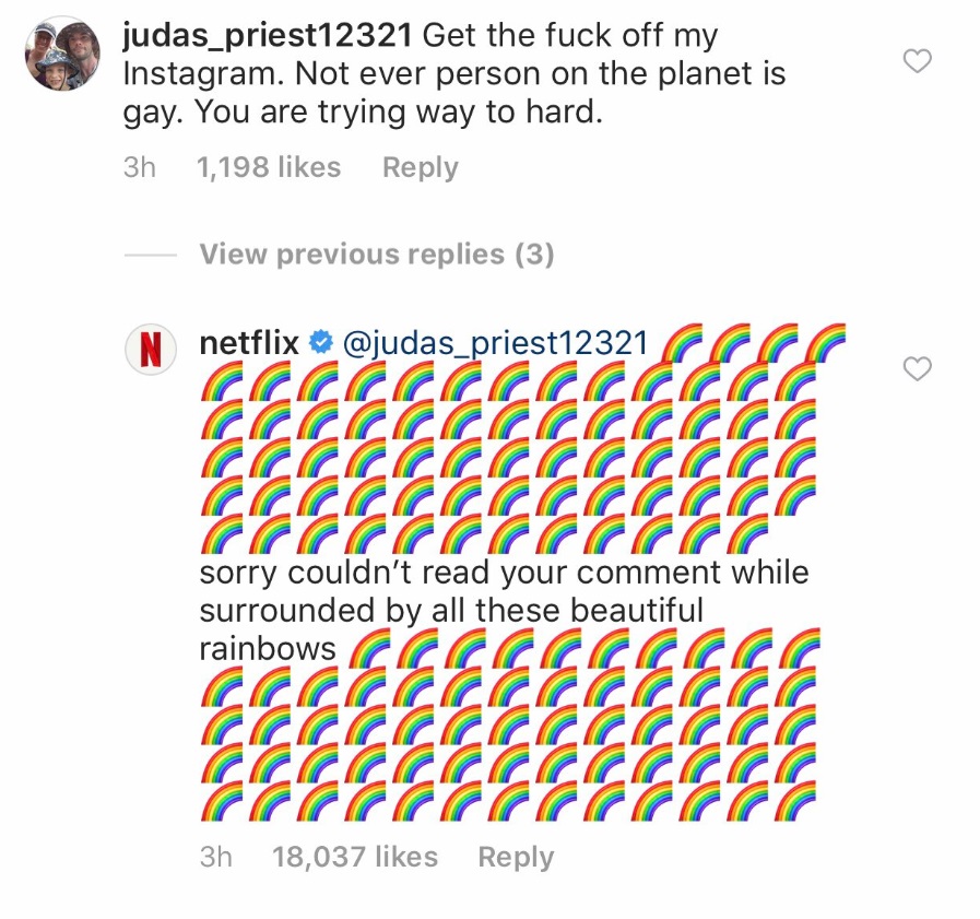 Netflix weren’t about to lose sleep over it, however, and replied to one particularly eloquent comment telling the couple to “get the f**k off [their] Instagram” with a tide of of rainbow emojis.