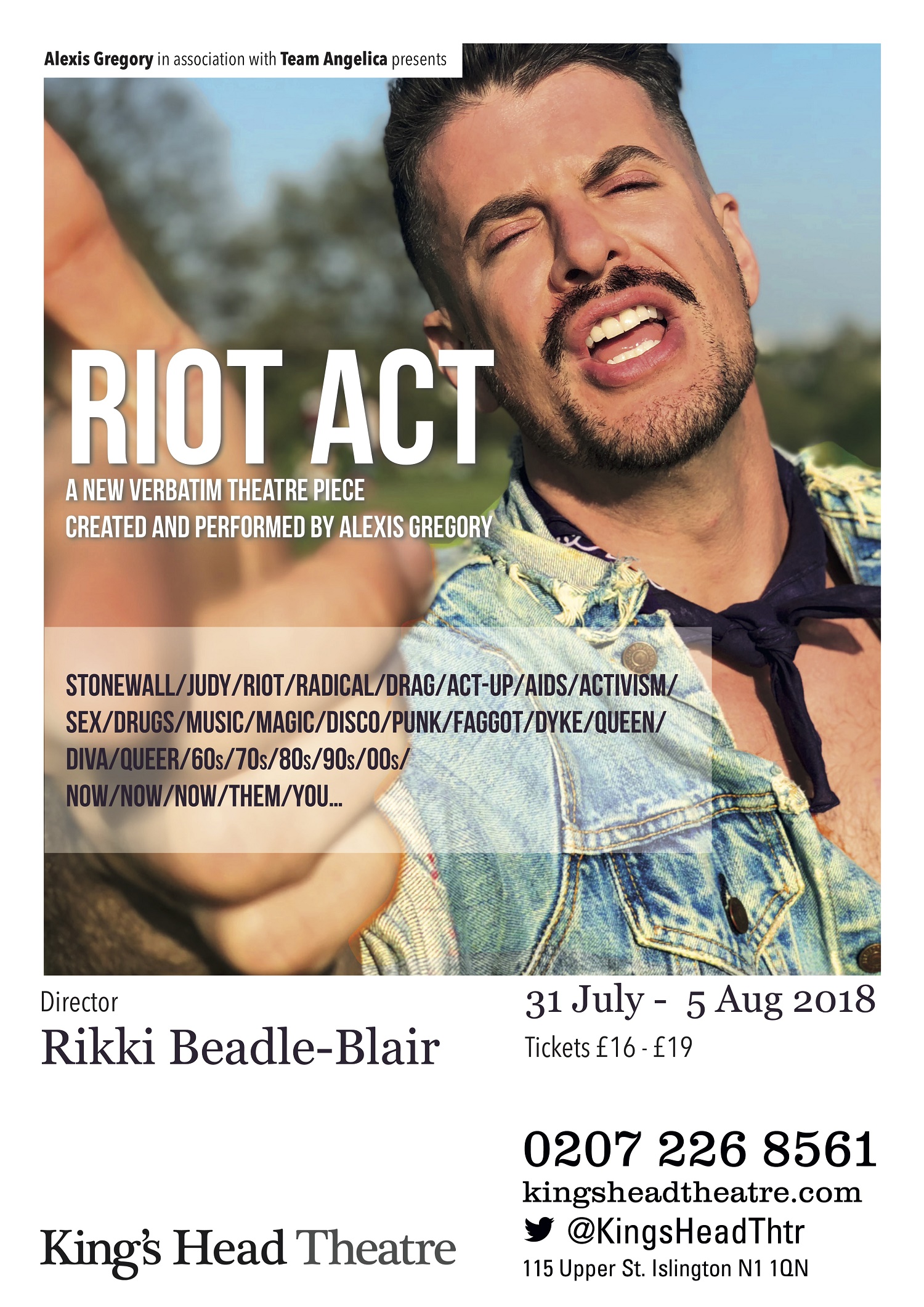 London-based playwright Alexis Gregory is premiering his hotly-anticipated new show Riot Act this week for The King’s Head Theatre’s queer season.