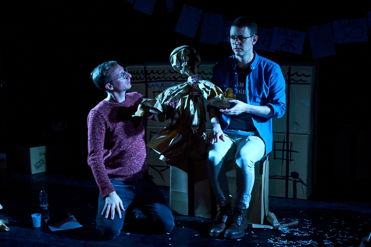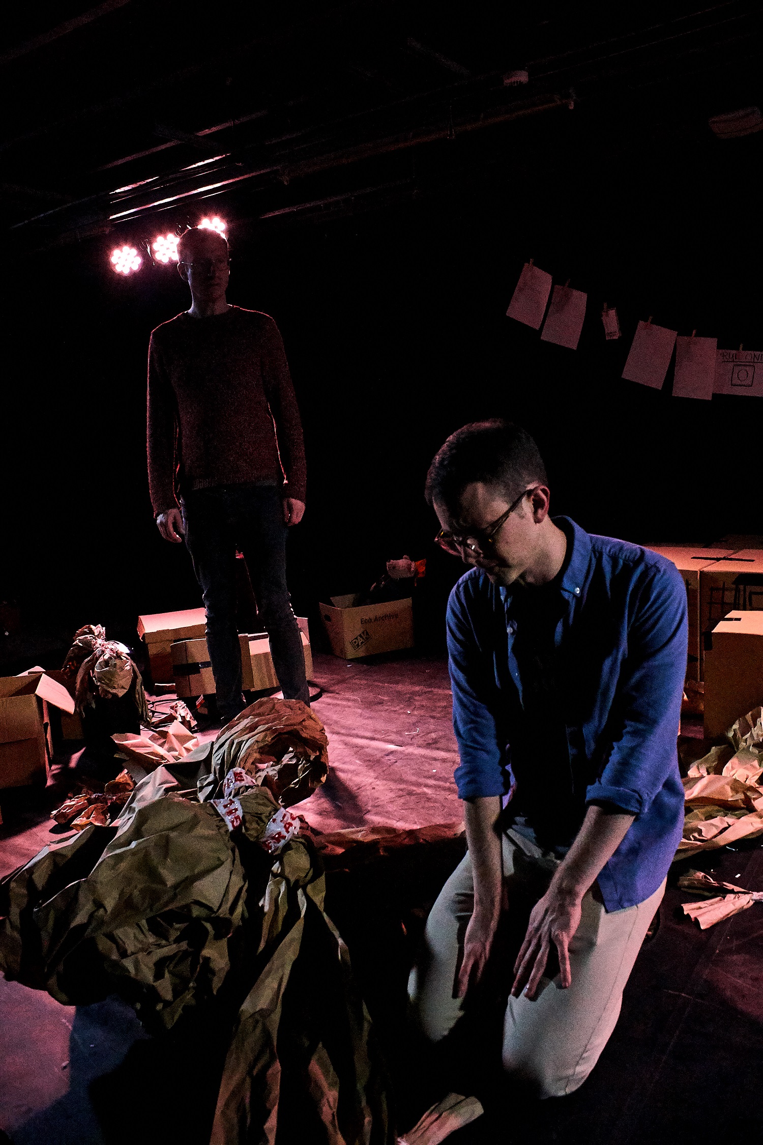 A set of boxes strewed across the space, the couple literally unpack the issues they’ve faced. Chris is an American from a Christian family who has never kissed a boy before.