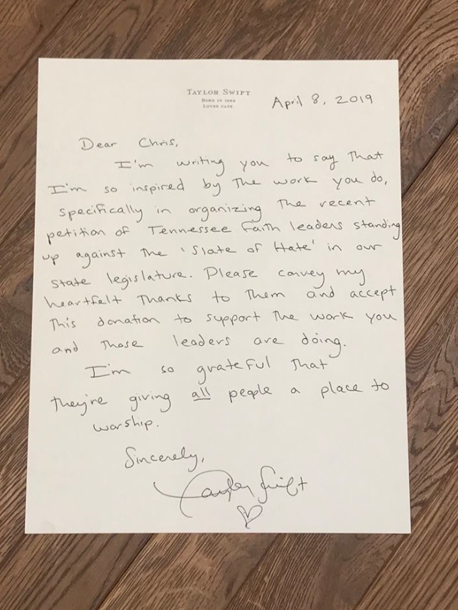 In her handwritten letter, Swift praised the dozens of religious leaders in the state who have signed a petition publicly denouncing the bills, adding that she hoped her donation would help their work and that of the Tennessee Equaltiy network.