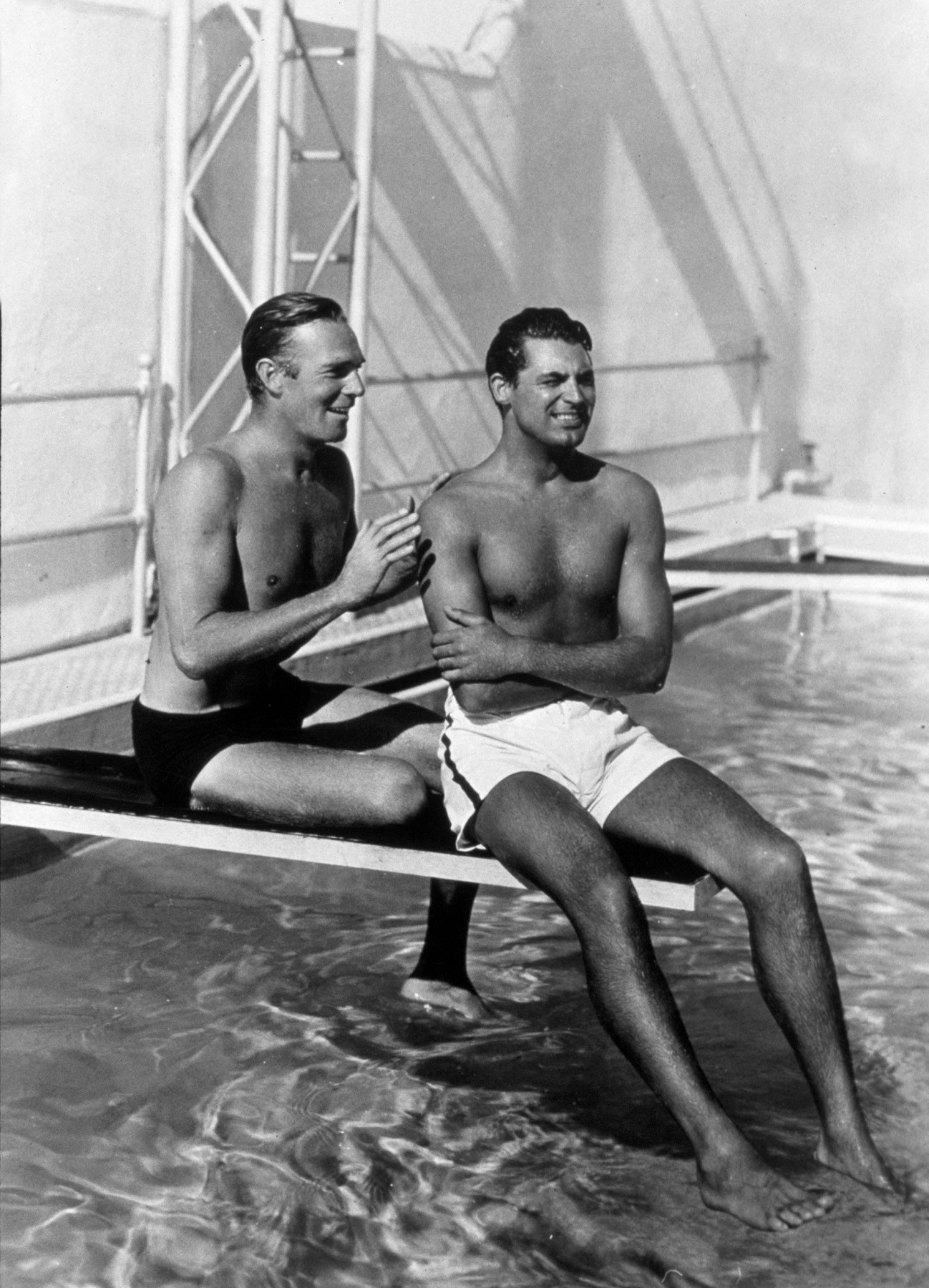 Printed in movie mag Modern Screen, one depicts the pair reading and relaxing together, Grant lying submissively at Scott’s feet in a scene of domestic bliss. Another shows the handsome duo perched on a diving board together, Scott’s hand outstretched as if moments away from brushing Grant’s bare shoulder.