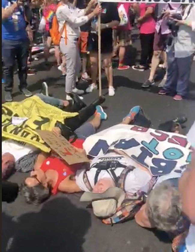 Five of the women laid down on the road as another three dropped a banner over them reading: “Transactivism erases lesbians”.