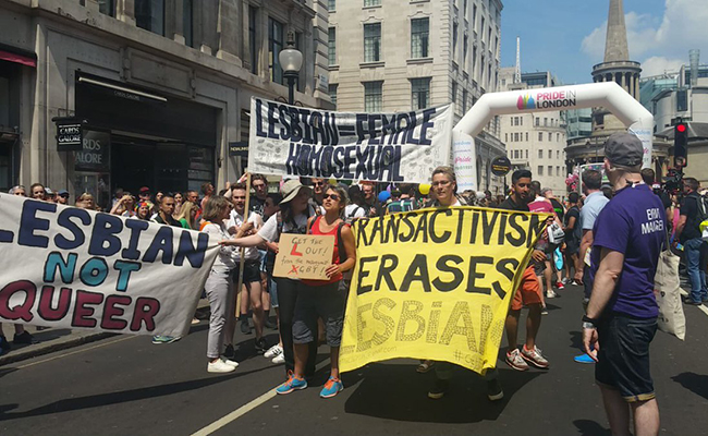 The women, who carried another banner which read “Lesbian = female homosexual”, reportedly blocked the march for 10 minutes. One activist allegedly shouted: “A man who says he’s a lesbian is a rapist”.