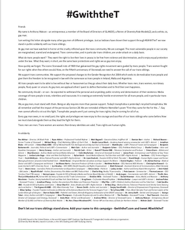 Entrepreneur, Anthony Watson, writes in the letter: “As gay men we have watched in horror at the cruelty inflicted upon the trans community.