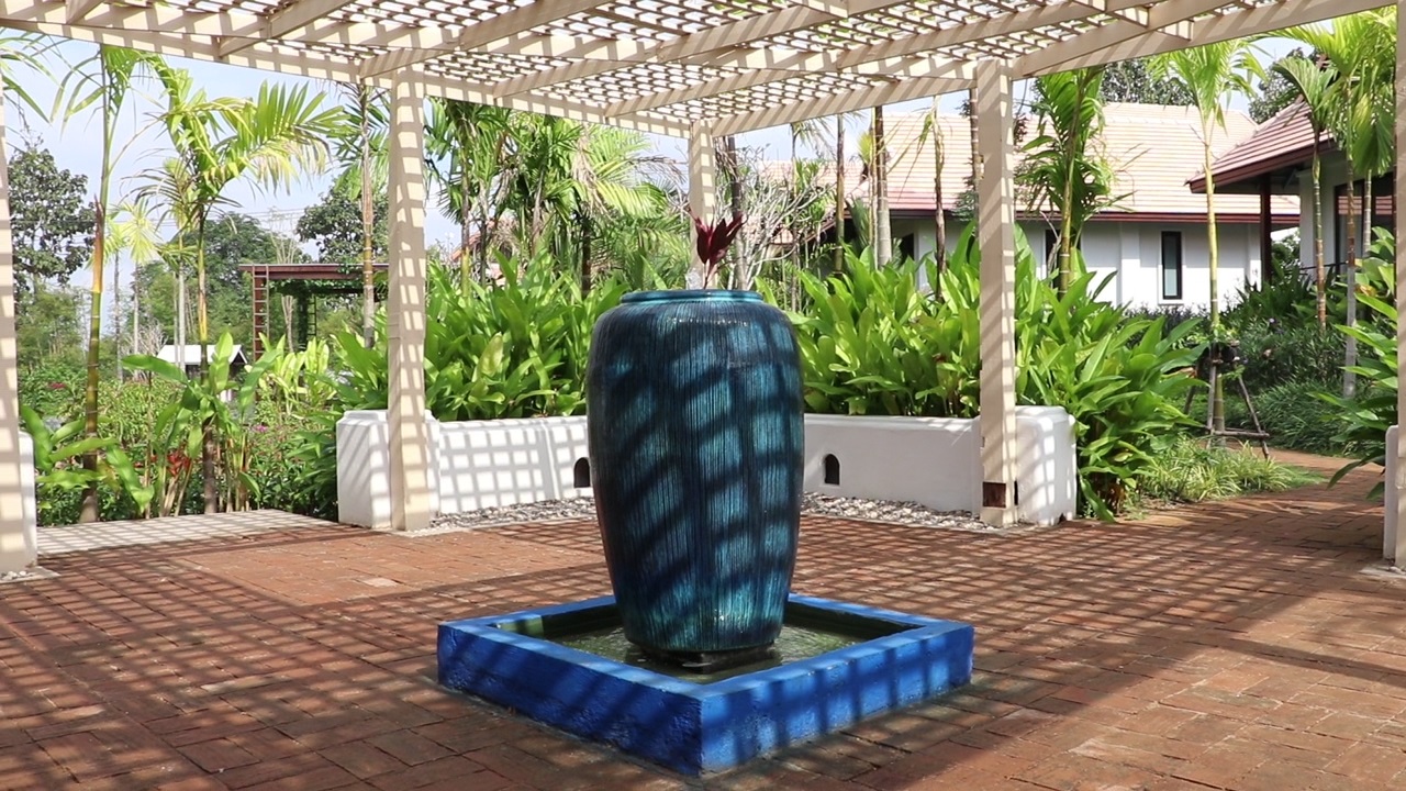 The huts that are visible through the foliage look akin to those in a fancy resort, with their perfectly manicured gardens and man-made lakes.