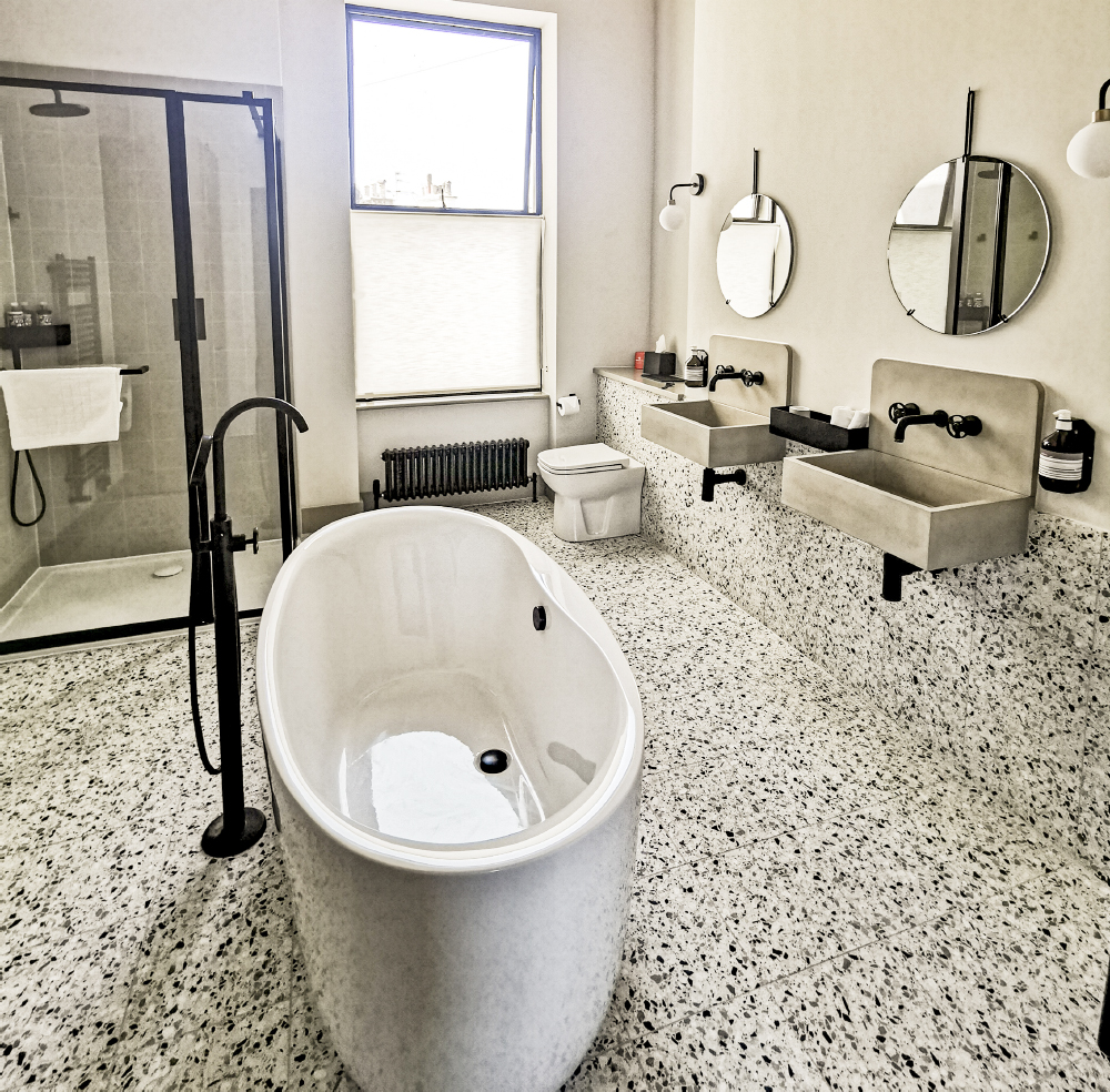 Back inside, the bathroom screams Bauhaus. There is a spacious rain shower in one corner, his and his sinks and a big bath smack dab in the middle of the room. Apart from the apartment’s generous size, another benefit is its record player and vinyl collection, which we play as we rest our feet on the end-of-bed sofa.