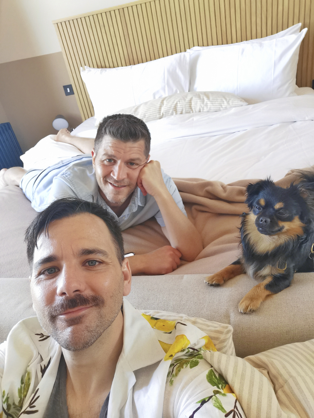 Exhausted, we are soon in the big bed watching the latest episode of Drag Race feeling like we are miles apart even though there are three in the bed (including the dog). The Hotel did provide Freddie with his own dog bed, water bowl, and treats, but he would rather sleep with his dads, obvs.