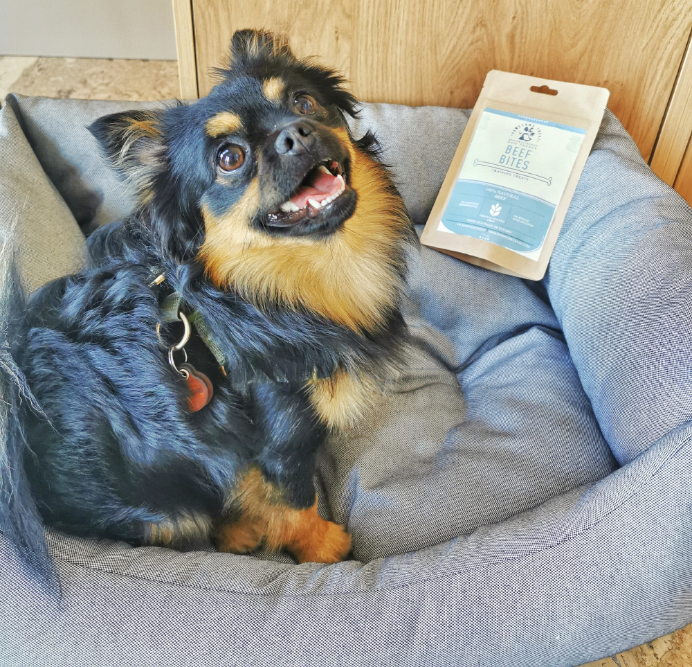 Freddie in the dog bed that the Port Hotel provided for our stay
