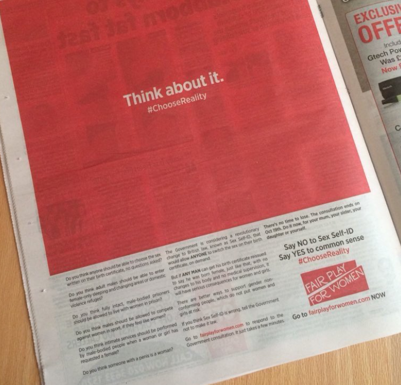 The full-page advert encouraging people to “Say NO to sex self-ID” came as the government prepares to close its public consultation on reforming the Gender Recognition Act (GRA) 2004.