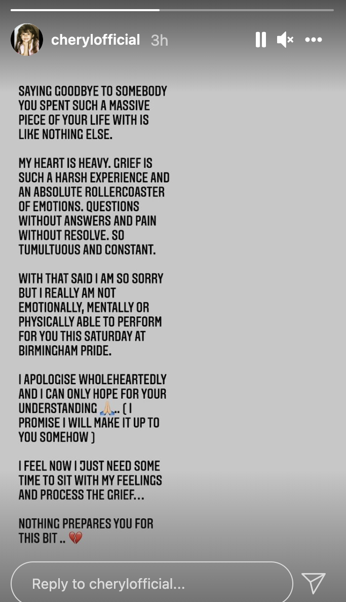 Cheryl has pulled out of Birmingham Pride saying she is grieving over the death of her former Girls Aloud bandmate, Sarah Harding.