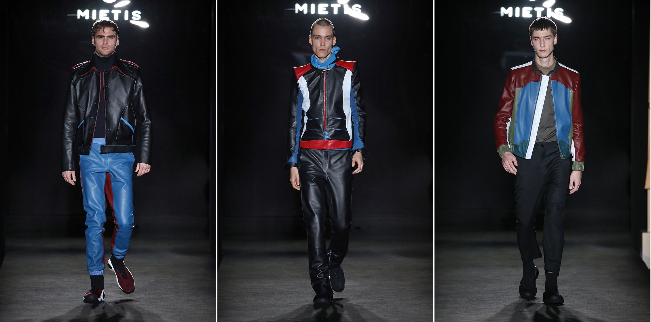 Strong hues of blues, blacks, reds and yellows gave the menswear a vibrant look, set against a monochromatic backdrop, allowing the bold, pieced-together leather to stand out.