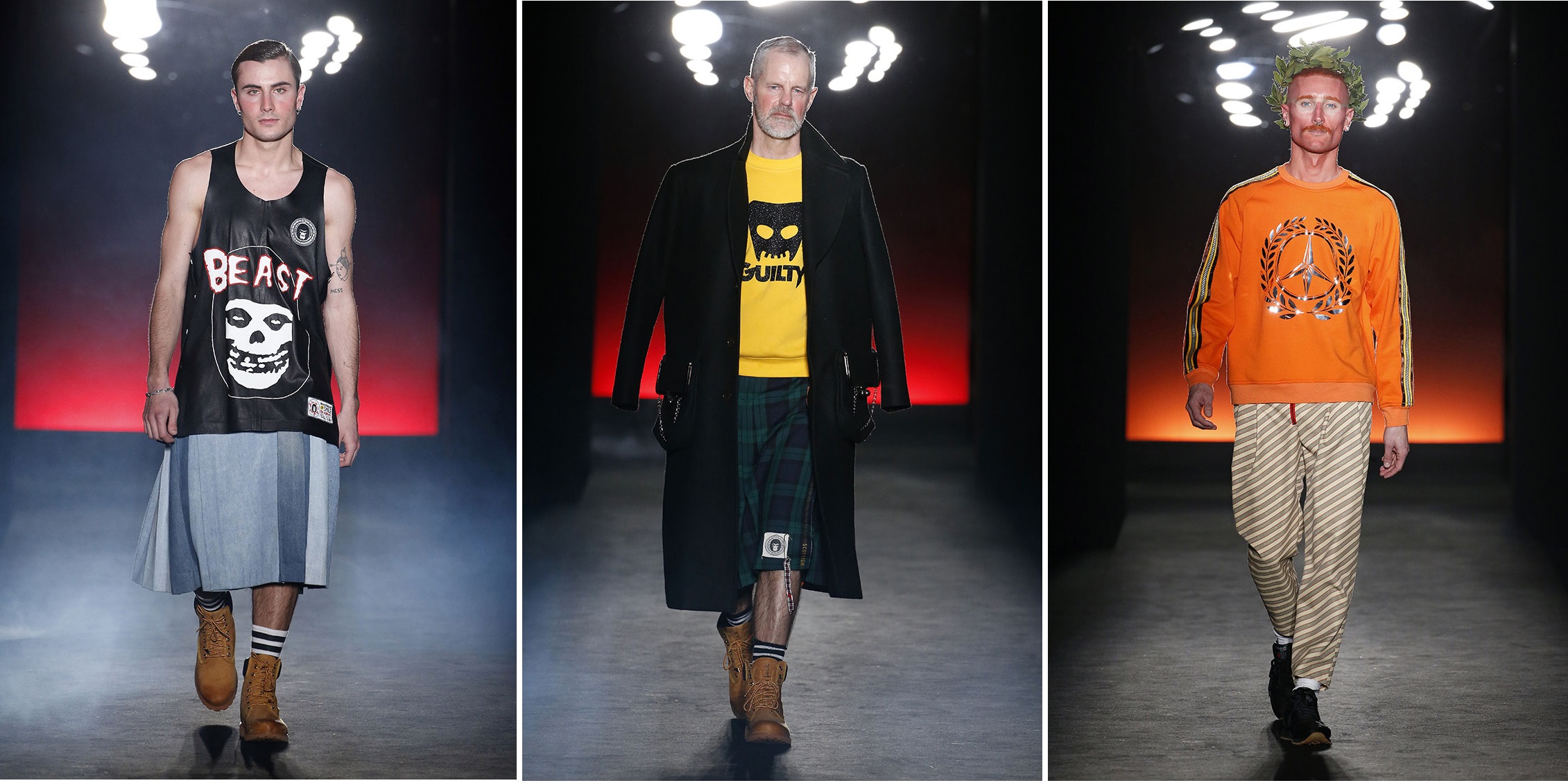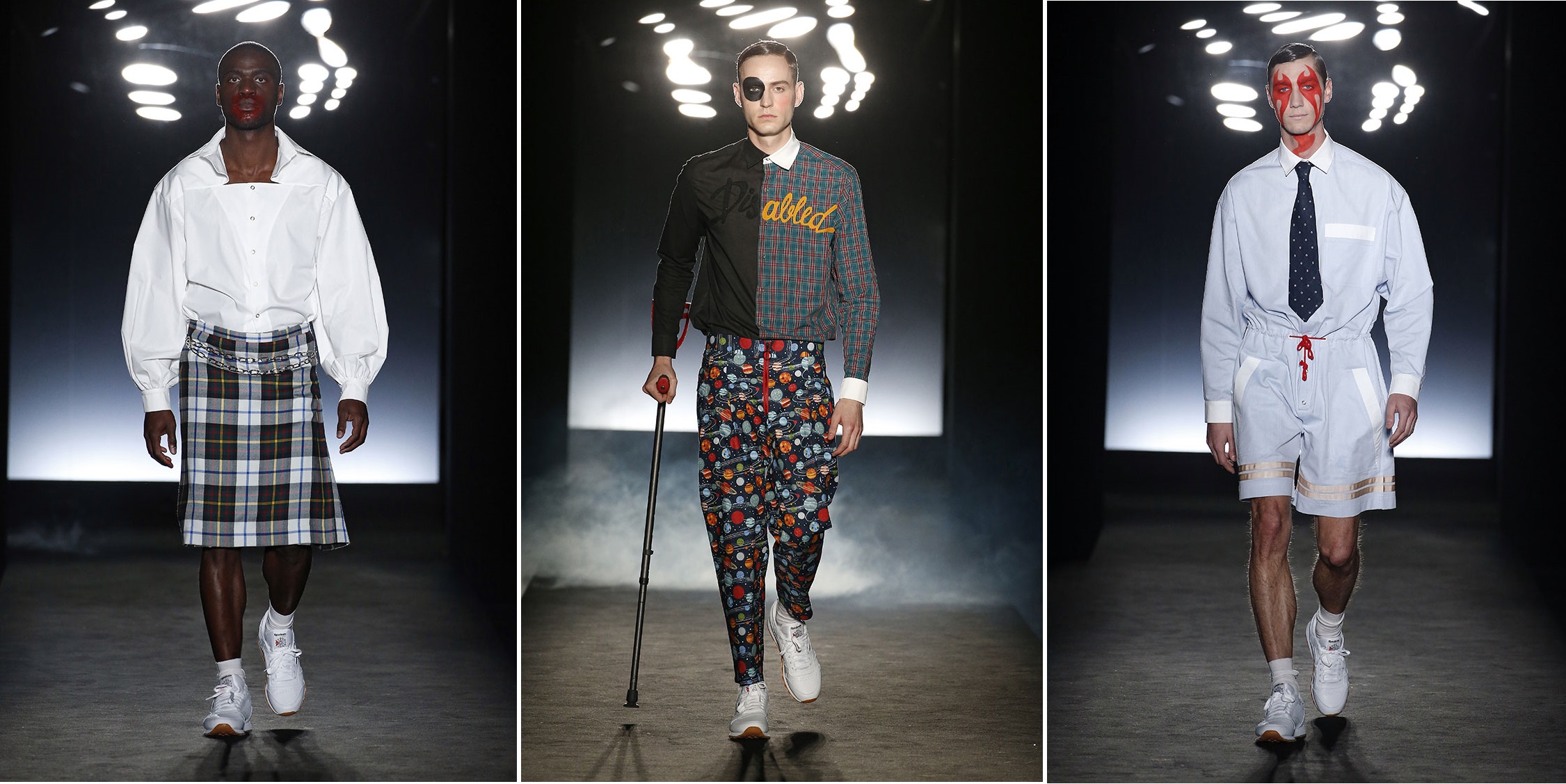 Logos from the likes of Grindr and North Face were given a Brain & Beast makeover over deconstructed denim, tracksuits and formalwear as models made their own statement in eye-patches and facepaint.