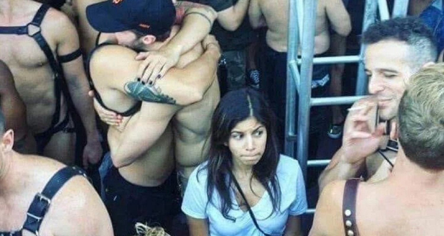Star of meme showing woman surrounded by men in harnesses identified